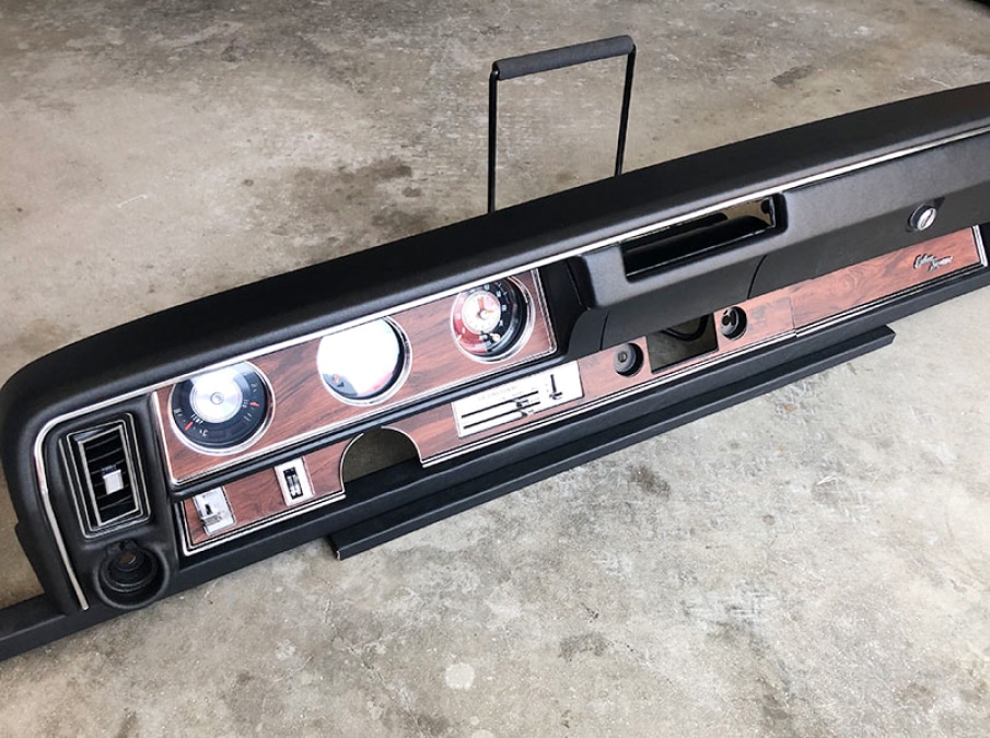Yet, reproductions can be the smarter choice in specific scenarios, such as with hard plastic instrument bezels, vents, and other minor components. At Just Dashes, we meticulously source top-tier reproductions, integrating them into comprehensive dash assemblies. This strategy enhances mounting points and avoids the warpage often found in aged plastics. For example, on this ‘69 Dodge Charger, we restored all the original parts except of the hard plastic instrument bezel and dash trim pieces…